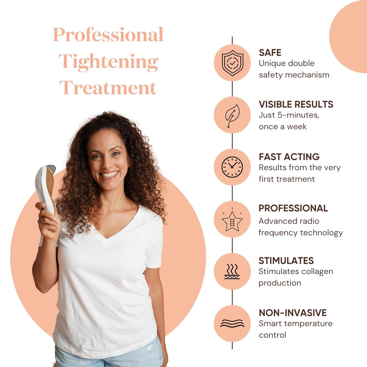 SAFE, CONTROLLED & EFFECTIVE AT-HOME TREATMENTS Built-in temperature regulation and skin-contact sensors help keep treatments within the effective RF range—high enough to deliver results, yet controlled for comfort and safety on delicate facial skin.
