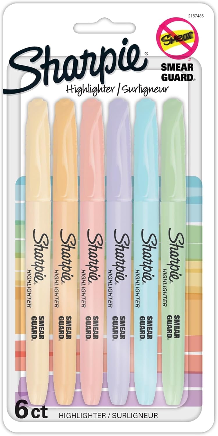 Sharpie Accent Highlighters w/Smear Guard – Chisel Marker Point – Assorted Ink – 6 / Pack Pocket Sharpie Highlighters with Smear Guard are specially formulated to resist smearing other inks. Each offers an easy gliding chisel tip for smooth highlighting. Bright see-through colors allow you to get information faster. Versatile chisel tip highlights wide and narrow lines of text. Quick-drying, odorless ink is certified AP nontoxic. Highlighter resists smearing on ink from many leading inkjet printers and ballpoint pens.