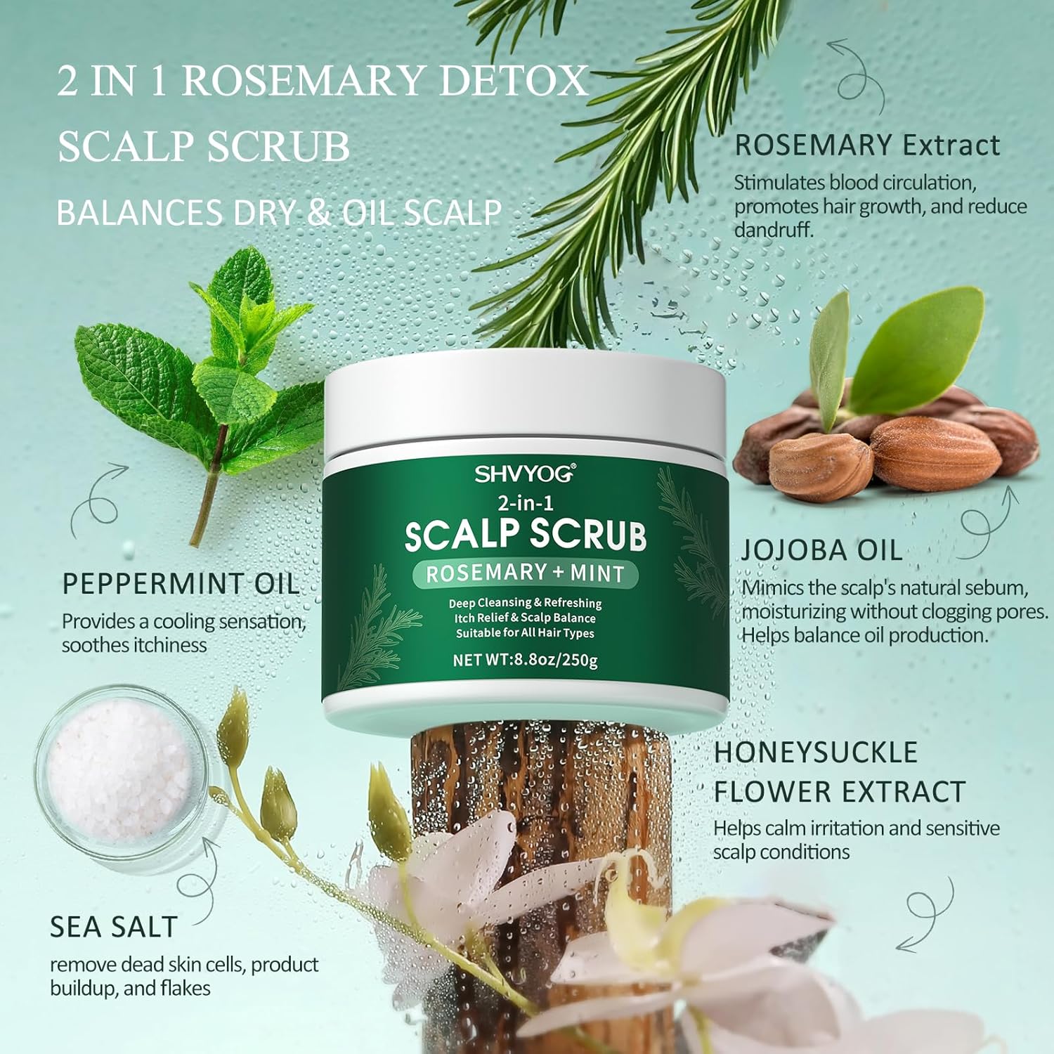 【EFFECTIVE FORMULA】Infused with rosemary essential oil, peppermint oil, sea salt, honeysuckle flower extract, jojoba seed oil, helping your overall hair health, remove dandruff and flakiness, promotes hair growth, recover your scalp & hair, suitable for sensitive scalp