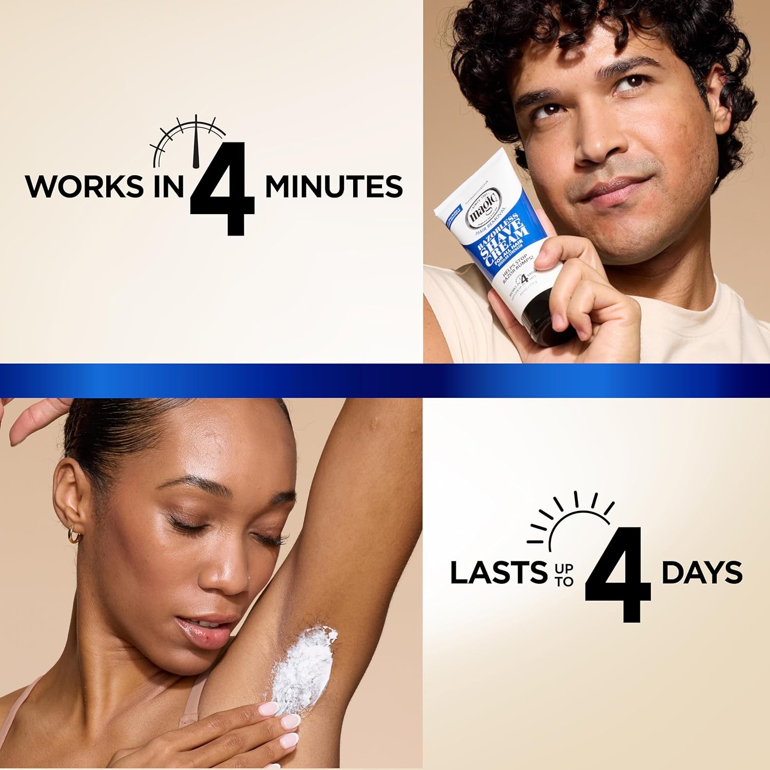 Our Razorless Cream Shave has been formulated to help stop razor bumps and give a closer shave than a razor to all body parts. This hair removal cream features a light fresh scent and works in 4 minutes to last for 4 days. Before using Magic Cream Shave for the first time, the following test must be performed. Wait at least 36 hours after using a razor or depilatory product before doing this test. Apply cream to a quarter size area of body hair. Wait 4 minutes before removing. Do not scrape. Rinse area thoroughly. After 24 hours, if there is no sign of irritation or redness follow directions on product. The more you use Magic Shave the better it works. We believe in beauty without compromise. IMPORTANT: Contains Thioglycolate. If skin is inflamed or has abrasions, sores or pustules, consult a dermatologist before use. Conduct sensitivity test before use. Wait 36 hours after using any razor or shaving powder before using this product. Do not use with any after shave product containing alcohol. This is a safety summary. Read all product labeling and instructions completely.