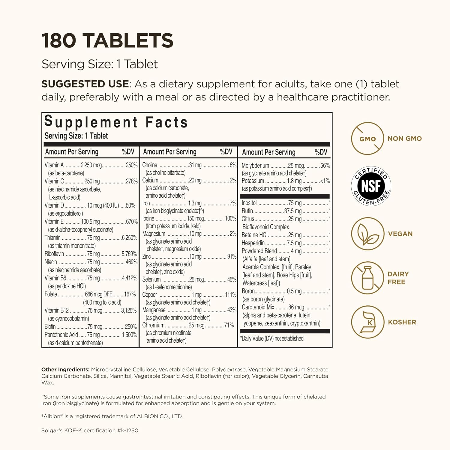 Gluten, Wheat & Dairy Free; Solgar Formula VM-75 is vegan, kosher and free of: gluten, wheat, dairy, yeast, sugar, sodium, artificial flavor, and preservatives