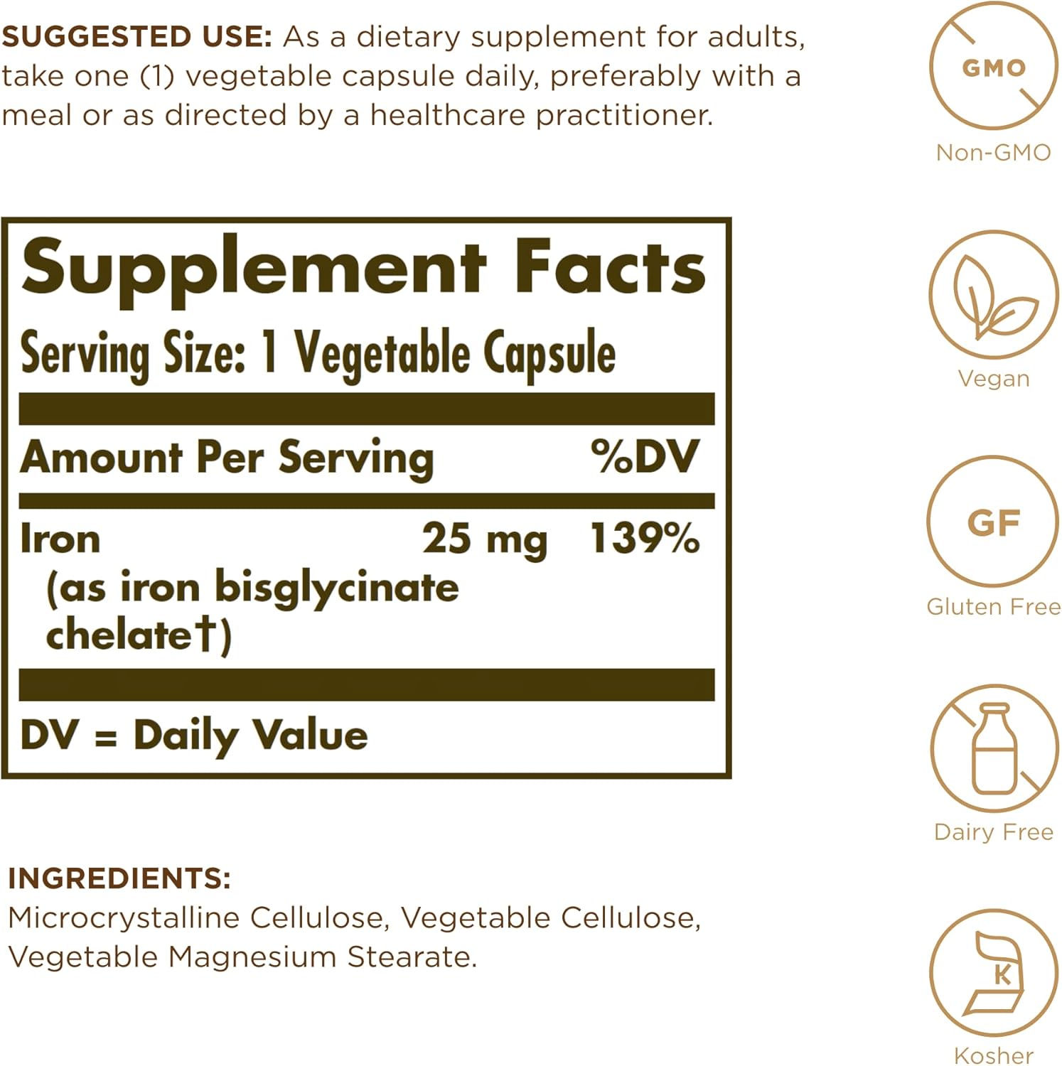 Solgar Gentle Iron (Iron Bisglycinate) 25 mg – 90 Vegetable Capsules – Non-Constipating, Gentle on Your Stomach – Non-GMO, Gluten Free – 90 Servings