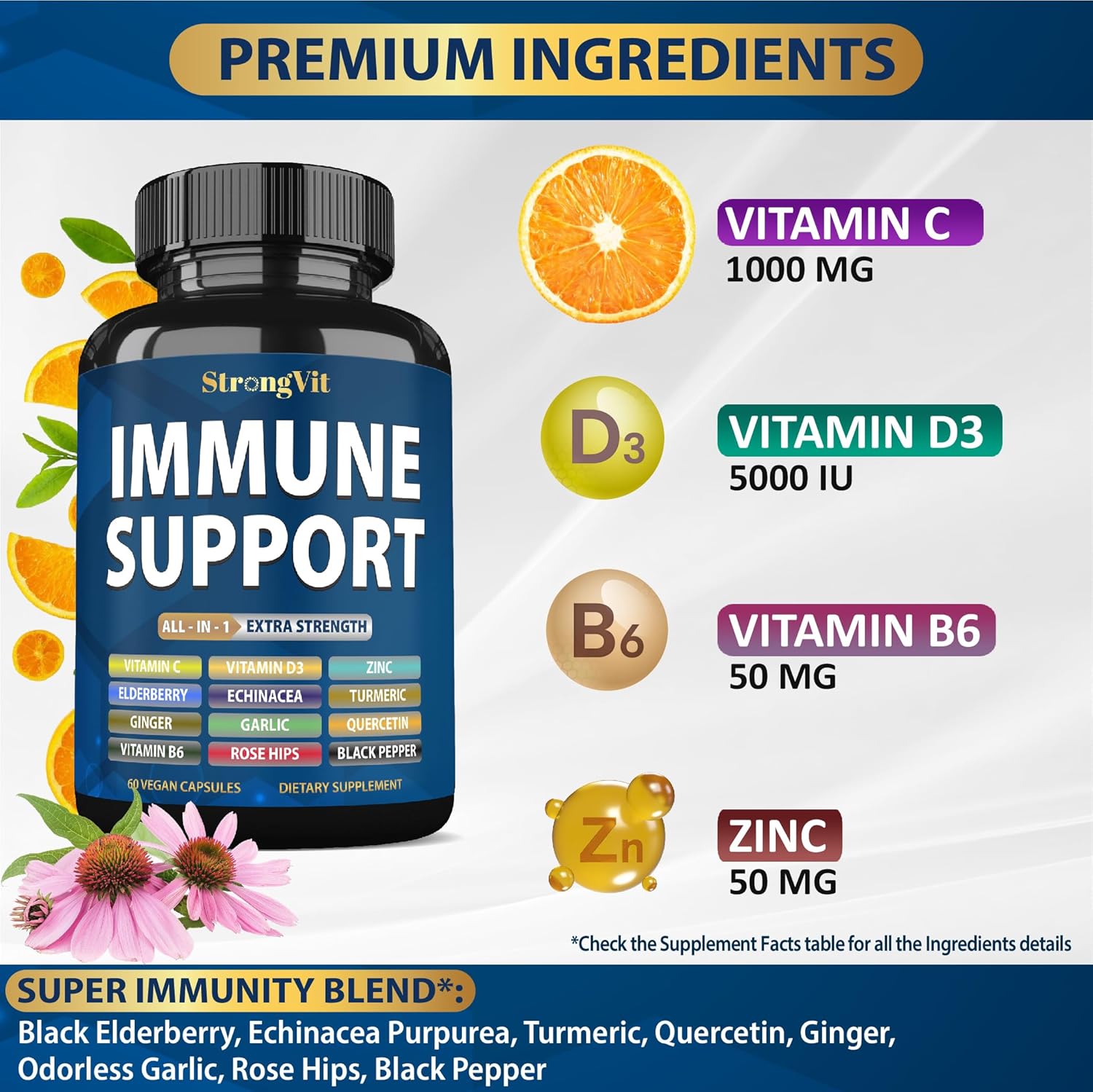 StrongVit Immune Support Supplement 12 in 1 Complex with Vitamin C, D3, Zinc, Echinacea, Elderberry, Ginger, Turmeric. Immune Defend for Men & Women, Non-GMO, Gluten-Free, Vegan, USA