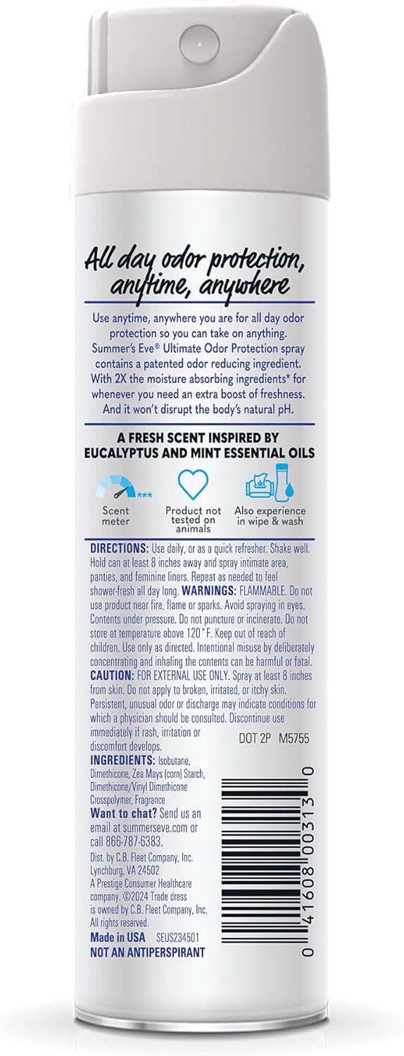 Summer’s Eve Ultimate Odor Protection Intimate Body Spray for Women contains a patented odor reducing ingredient. This unique spray formula absorbs 2x the moisture* from sweat, and sprays on dry for an extra boost of freshness whenever you need it. Summer’s Eve Ultimate Odor Protection intimate spray for women is a great moisture-absorbing feminine spray with twice the absorbing power of other Summer’s Eve sprays. Take your feminine care to the next level with a clinically-tested, talcum-free, feminine spray that reduces odor without disrupting the natural pH range of a woman’s external intimate area. This fresh scent feminine spray is ideal for on-the-go odor control; keep in your purse, gym bag, or luggage to absorb moisture and eliminate vaginal odor while travelling to leave you feeling fresh and confident all day.