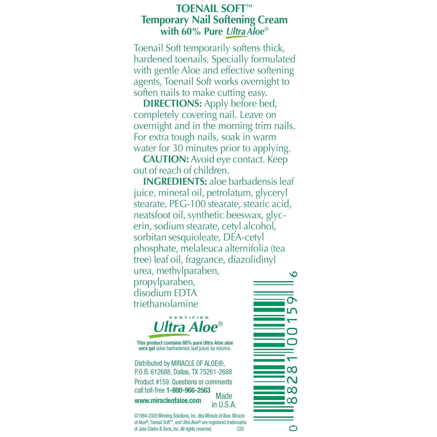 60% ALOE VERA GEL: Special softening agents and pure, 60% UltraAloe aloe vera gel penetrates nails to soften nails for cutting and trimming.