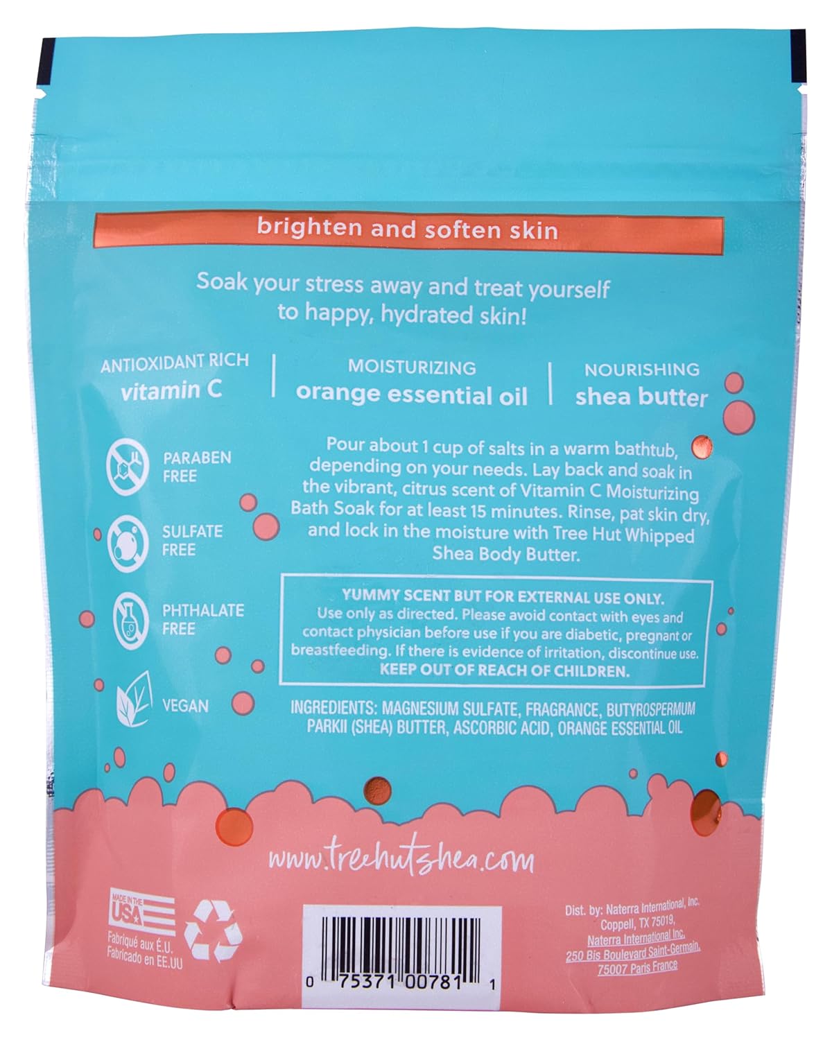 Prepare to be pampered with Tree Hut Vitamin C Brightening Bath Soak in the glow-boosting scent of Vitamin C. Treat yourself to a relaxing bath soak that nourishes skin with hard-working ingredients and lifts the mood with a yummy scent. Our Tree Hut Brightening Bath Soak contains vitamin C, a powerful antioxidant known to help stimulate collagen production as well as brighten, firm, and even the appearance of skin. It also contains Orange essential oil, which helps maintain skin’s moisture balance and Natural shea butter to deeply moisturize, nourish, and soften dry skin while helping to promote elasticity.