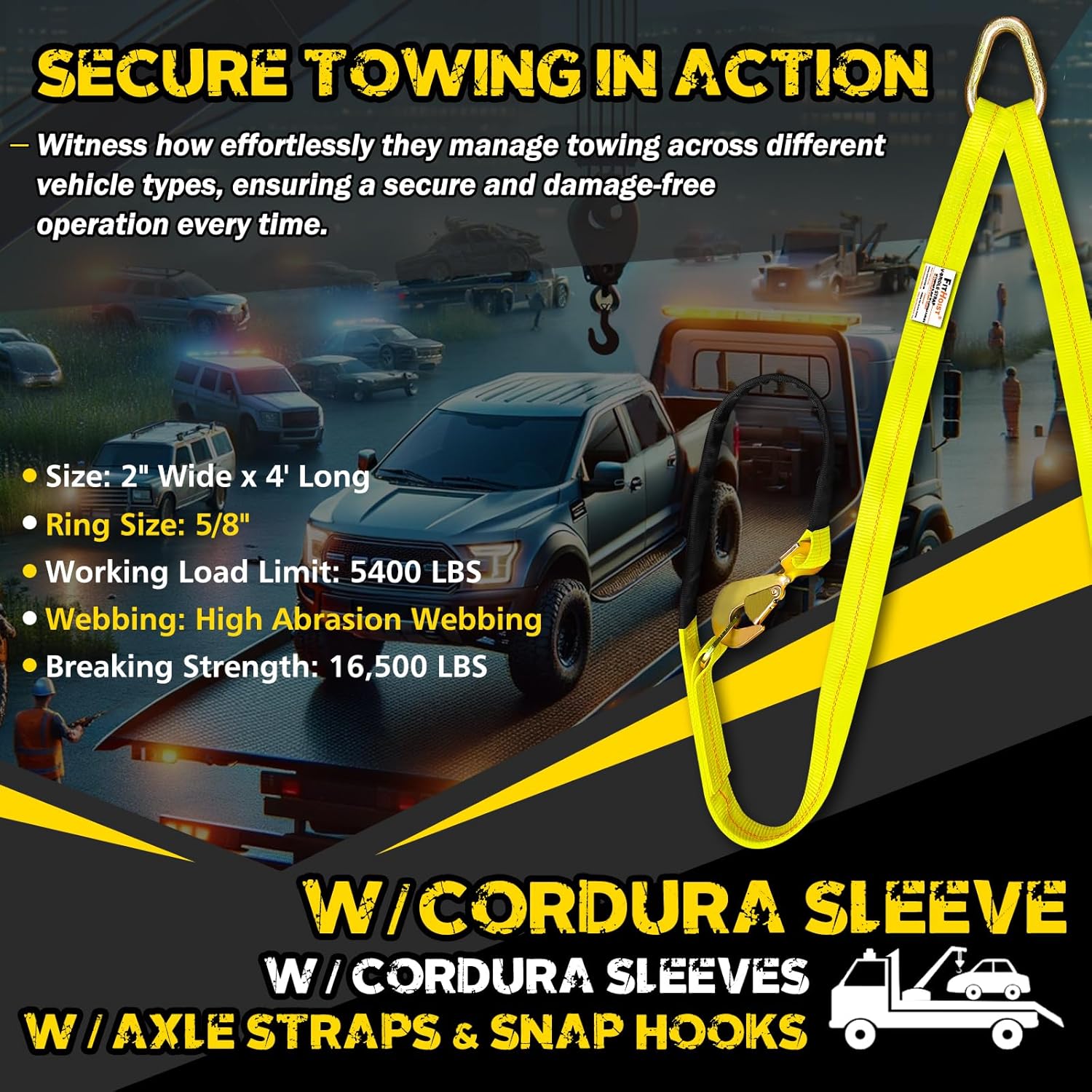 【Towing Solution】Equipped with robust axle straps and versatile connection points, our tow strap excels in diverse towing scenarios, including rollbacks, flatbeds, and wrecker recoveries. Its adaptable and durable design meets the demands of heavy-duty towing tasks, ensuring reliability and performance under any conditions.