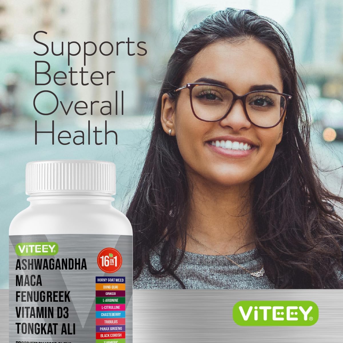 Viteey Ashwagandha Maca Fenugreek Supplement with Tongkat Ali – Drive, Passion & Energy Support for Men & Women – Mood, Calm & Stress Support – 60 Capsules