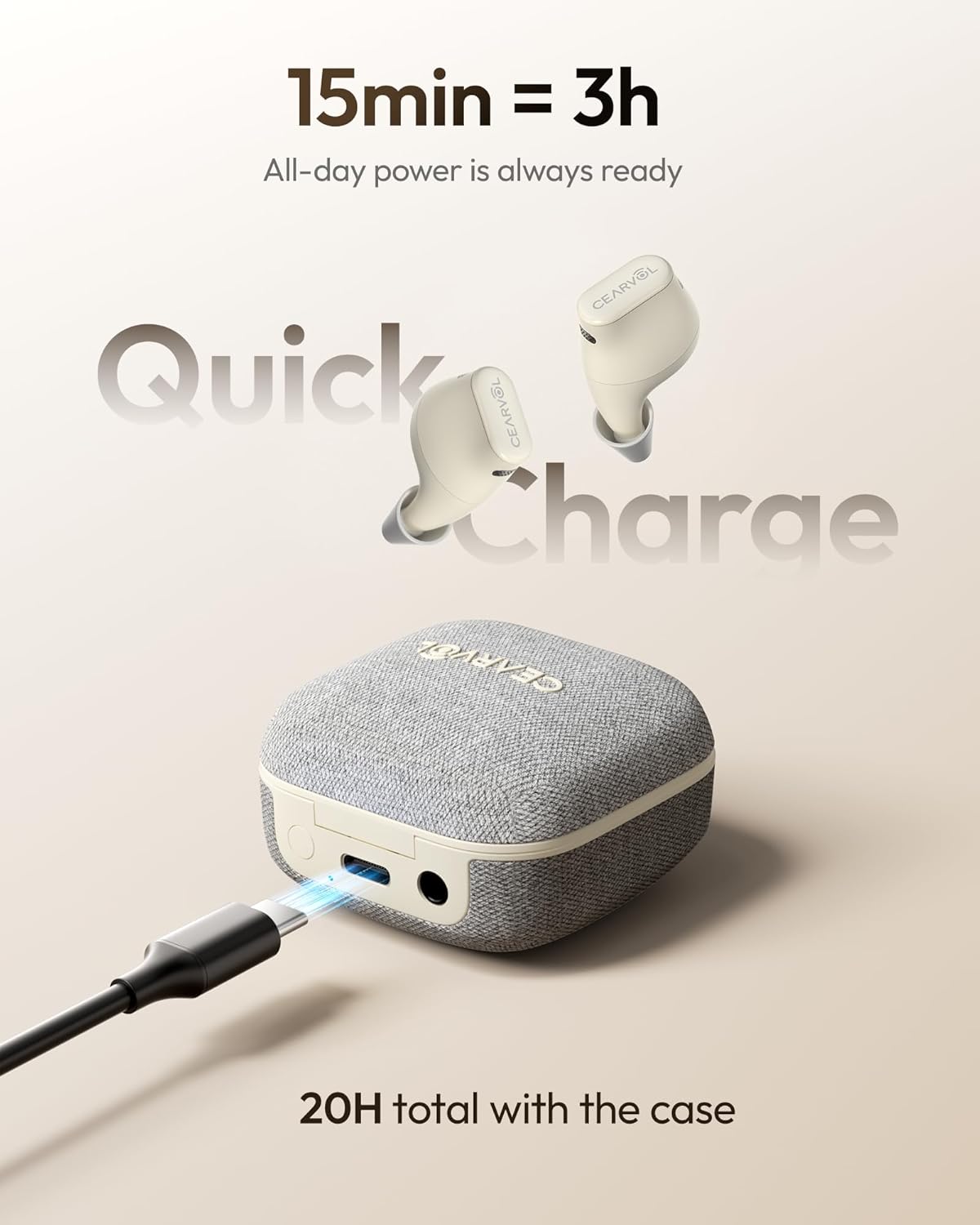 Enjoy up to 22 hours of total power with the charging case. Note that frequent Bluetooth streaming (calls/music) may reduce runtime by ~30%. For convenience, a 15-minute quick charge provides 3 hours of listening time.